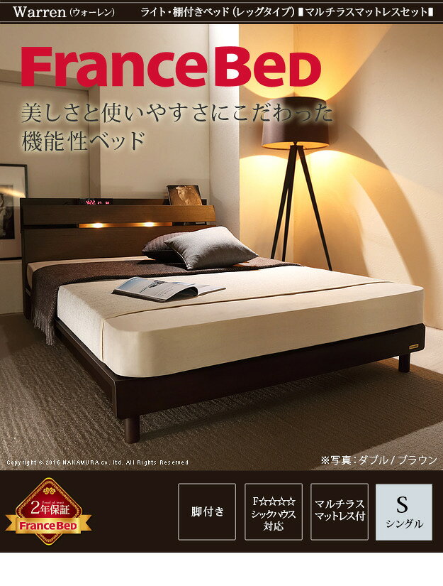 フランスベッド ライト・棚付きベッド ウォーレン レッグタイプ シングル マルチラススーパースプリングマットレスセット mu-i-4700553送料無料 北欧 モダン 家具 インテリア ナチュラル テイスト 新生活 オススメ おしゃれ 後払い フレーム