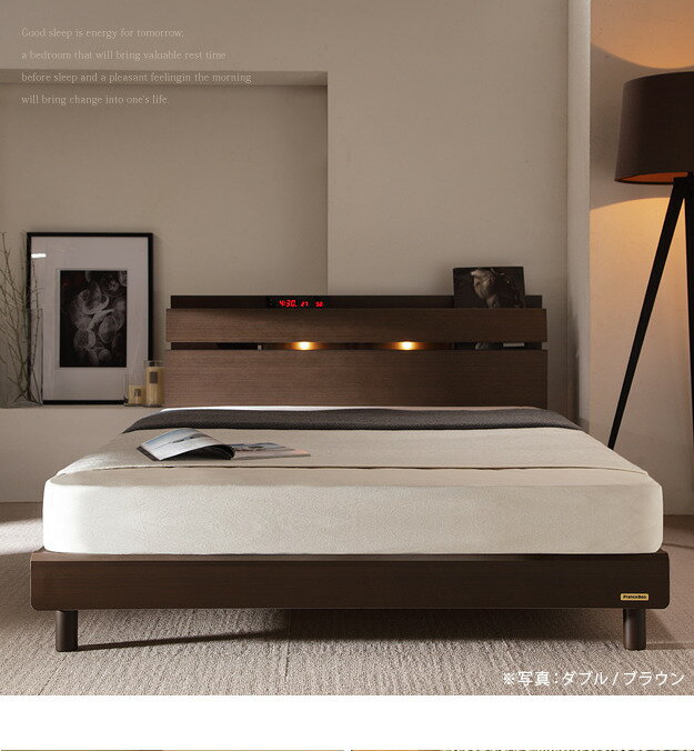 ●メーカー2年保証【セット構成】ベッドx1・マットレスx1【カラー】ブラウン・ナチュラル【仕様】■ベッド本体:天然木化粧合板(ウエンジ/タモ)・ファインセラミック塗装、プリント紙化粧合板床板:布張りコンセント:1口1500Wコード長さ:約1.7m照明:白熱灯1個10W(x1)◎組立品■マットレス張地:ポリエステル64%、綿27%、レーヨン9%中身:ウレタンフォーム、パームパッド、ポリエステル綿、防虫不織布コイル:マルチラススーパースプリング【サイズ】■ベッド外寸:幅102x奥行214x高さ81cm/約34kg床面高さ:22.5cm宮奥行:18cmフレーム下高さ:10.5cm■マットレス外寸:幅97x奥行195x高さ16cm/約17kg送料全国一律無料(沖縄・離島は配達不可)備考※お急ぎの場合は必ず事前に在庫確認を行って下さい。