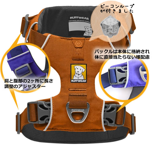 フロントレンジハーネスは、丈夫なリップストップ生地(リップストップ=裂け止め加工)や、しっかりとしたつくりはRuffwearを代表する人気商品、ウェブマスターハーネスと同じですが、普段はあまり必要とされない部分を取り除いたデイリーユース用のハーネスです。